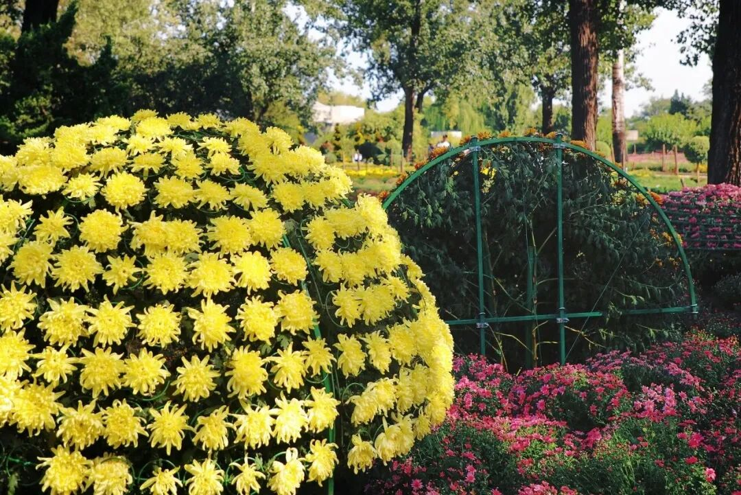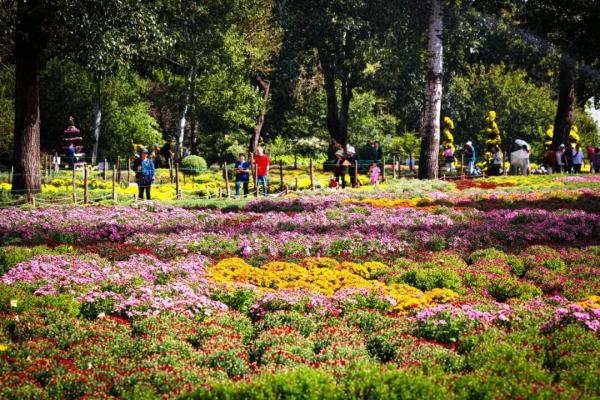 Des dizaines de milliers de chrysanthèmes, associés à des rosiers, des osmanthes d’argent et de nombreuses autres fleurs annuelles, tissent un magnifique paysage d’automne.